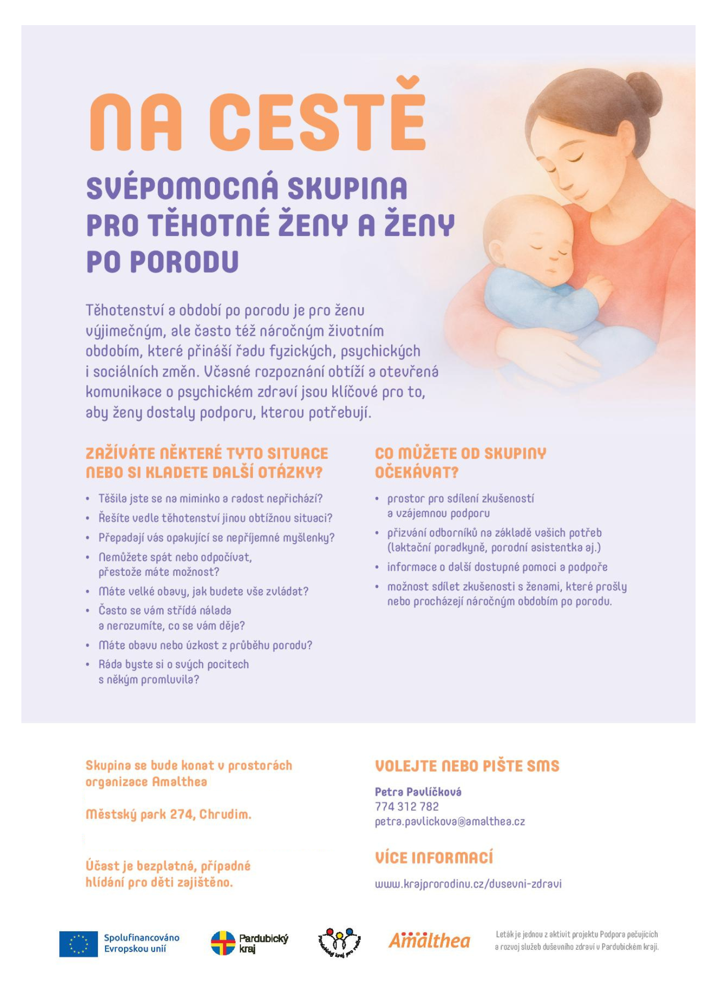 Amalthea otevírá v rámci projektu "Podpora pečujících a rozvoj služeb duševního zdraví v Pardubickém kraji" další svépomocnou skupinu Na cestě. Ta je určena těhotným ženám a maminkám po porodu, které procházejí náročným obdobím a potřebují podporu, sdílení i odborné informace.