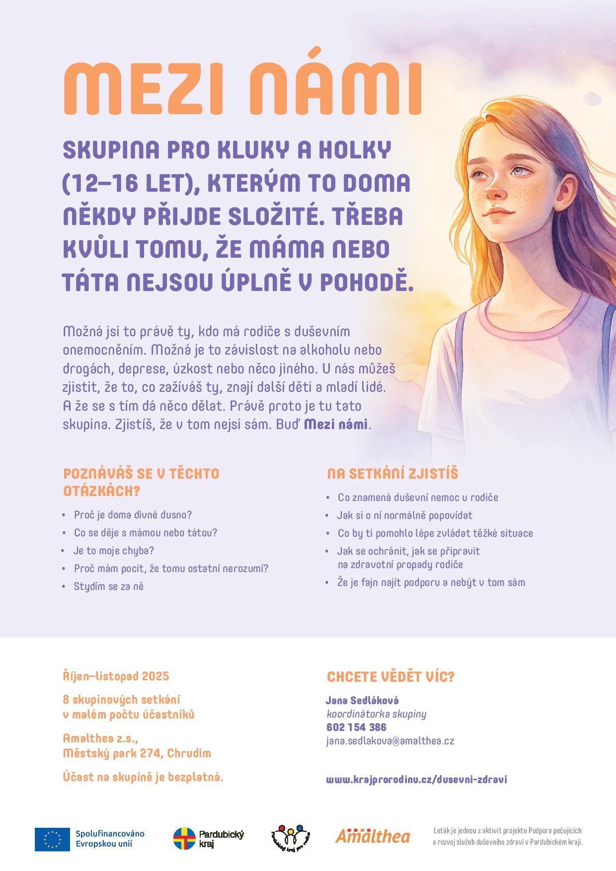 Od října do listopadu 2025 bude v Chrudimi probíhat nová svépomocná skupina „Mezi námi“ určená pro kluky a holky ve věku 12–16 let. Skupina je určena dětem, které doma zažívají složité situace – například proto, že jejich máma nebo táta mají duševní onemocnění či problémy se závislostí.
