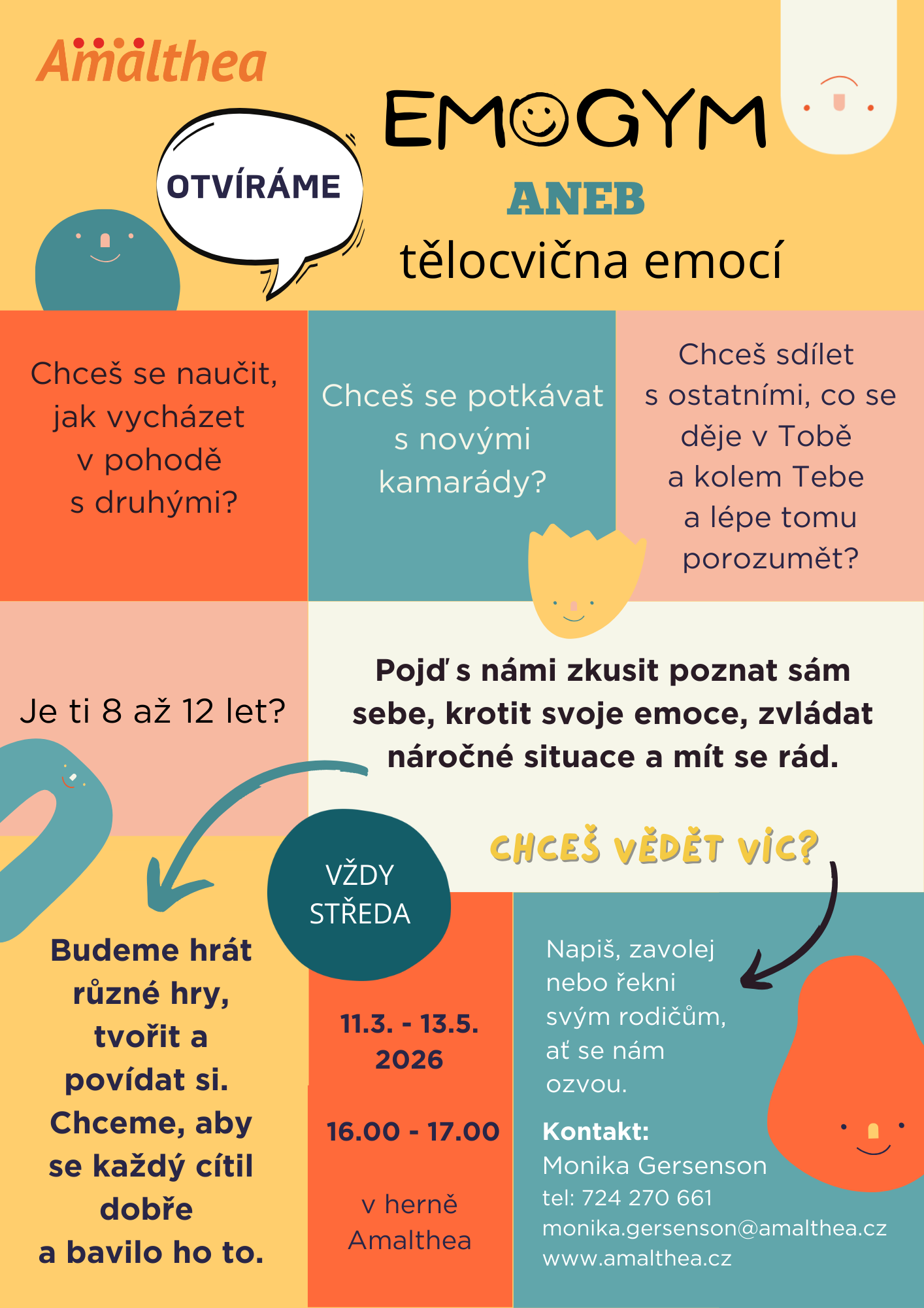 V březnu 2026 chystáme 4. běh tělocvičny emocí pro děti ve věku 8-12 let, které mají zájem lépe poznat samy sebe a svoje emoce, poznávat druhé, vytvářet s nimi dobré vztahy a naučit se zvládat náročné situace.